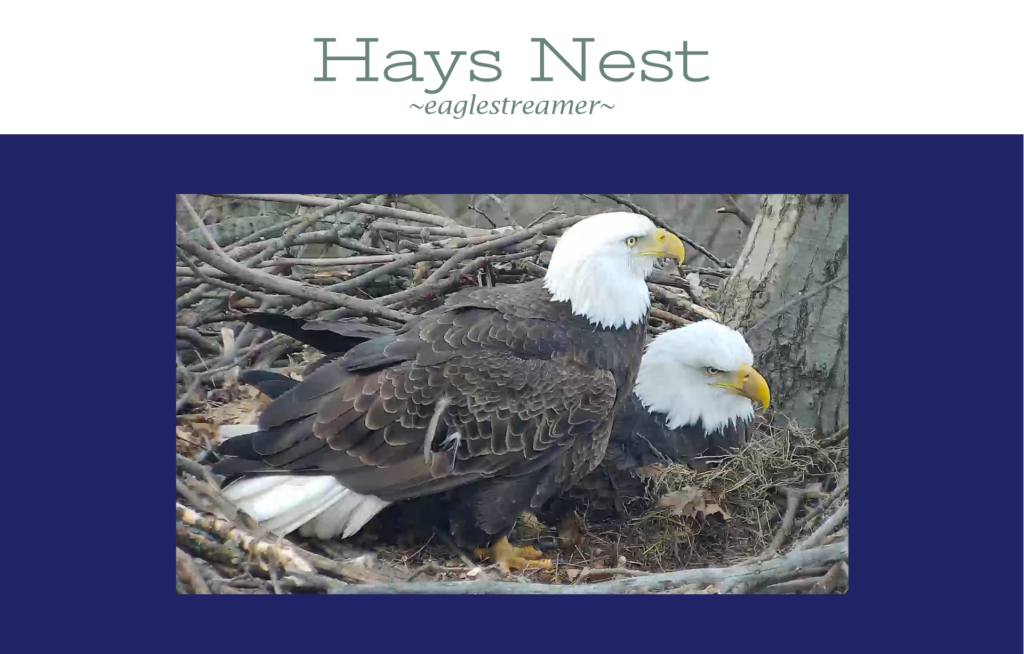 “Mom” & “Dad” Hays, the original territory holding pair at Hays. Together, between 2012 & 2023 they built four nests, successfully hatching & fledging 20 eaglets, all of whom we picture out there flying somewhere. In the fall of 2023 Dad was displaced by HM2. A few confirmed sightings of Dad subsequently, reassure us that he is still out there somewhere. (image credit: Pixcams)