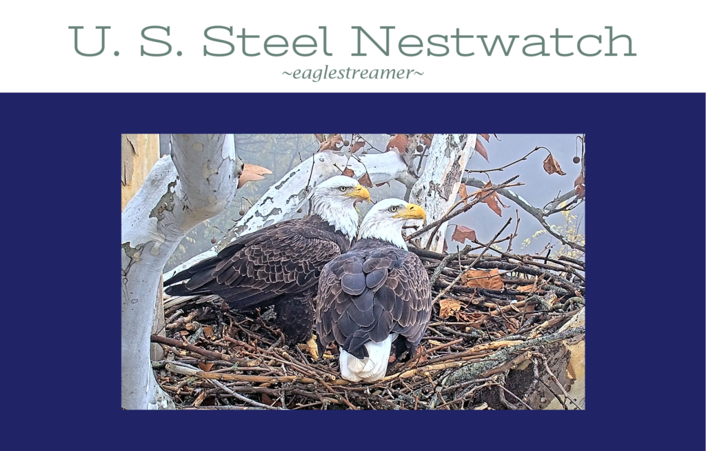 Irvin & Stella are the current territory holders at the USS nest. Their first nesting season together was 2025 after Stella displaced Claire in the fall of 2024. [image credit: U. S. Steel / Pixcams (with permission)]